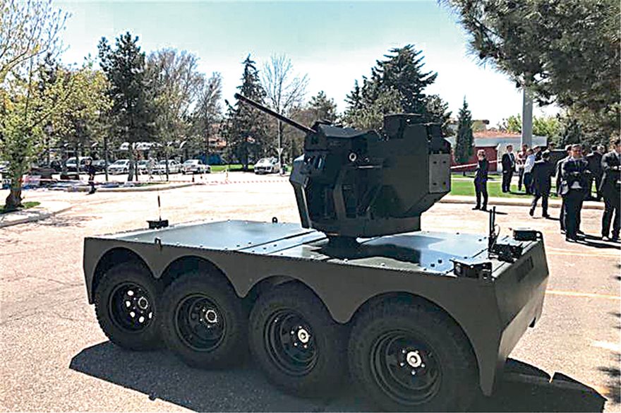 ■ «Tarantula», το mini drone τροχοφόρο: Την ίδια στιγμή, η Τουρκία επενδύει και στη λεγόμενη «Ταραντούλα». Πρόκειται για επίγειο μη επανδρωμένο τροχοφόρο. Κοινώς, μικρό άρμα μάχης, ένα μίνι τανκ που θα δρα υποστηρικτικά προς τις χερσαίες δυνάμεις. Τα εν λόγω drone tanks διαδίδεται ότι προορίζονται κυρίως για τον ‘Εβρο και άλλες δύσβατες περιοχές, καθώς περνάνε ακόμα και μέσα από ποτάμι ή κακοτράχαλο βουνό. Δεν υπάρχει κανένας περιορισμός κινήσεων. Ο Τούρκος υφυπουργός Άμυνας ήταν ο πρώτος που έδωσε στη δημοσιότητα τις πρώτες εικόνες του νέου μη επανδρωμένου τροχοφόρου οχήματος με την επωνυμία «Tarantula», εφοδιασμένο με πολυβόλο και άλλα «όπλα». Η «Ταραντούλα»… βλέπει 3 χιλιόμετρα μπροστά και μπορεί να λειτουργεί επί οκτώ ώρες. Παρακολουθεί, καταγράφει, πλήττει στόχους και έχει πρόσβαση παντού. Μπορεί να «φορτωθεί» με μικρούς πυραύλους, πολυβόλα, πυροβόλα μικρού διαμετρήματος και συστήματα παρατήρησης. Χρησιμοποιείται ήδη σε ειδικές καταστάσεις και αποστολές, ενώ το ελέγχουν μέσω δορυφόρου.